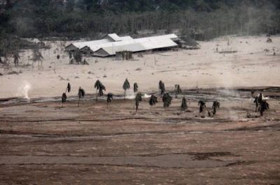 Volcanic ash has buried a number of houses, roads and a bridge.