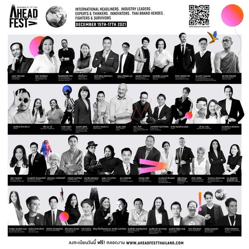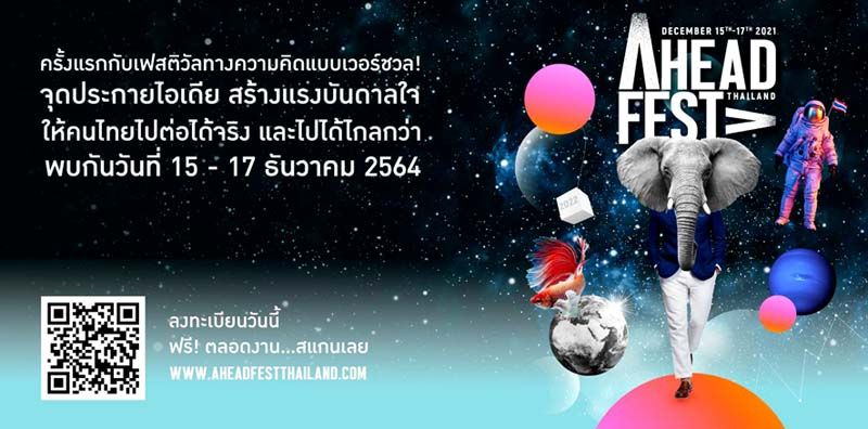 ครั้งแรกกับ AHEAD ! FEST THAILAND เฟสติวัลทางความคิดรูปแบบเวอร์ชวล 3 วันเต็ม จัดในลักษณะ Cross Lane การเสวนาแลกเปลี่ยนมุมมอง และกิจกรรมรูปแบบเวิร์กช็อป ที่คัดพิเศษให้ตอบโจทย์การใช้งานในชีวิตจริง จุดประกายไอเดียพร้อมสร้างแรงบันดาลใจ ให้คนไทยทุกคนและประเทศไทยไปต่อได้จริง และไปได้ไกลกว่า ทั้งหมดนี้จะเกิดขึ้นในวันที่ 15-17 ธันวาคม 2564 กิจกรรมดีๆ แบบฟรี! ตลอดงาน เพื่อให้ทุกคนได้รับประโยชน์จากงานนี้แบบ สนใจลงทะเบียนฟรีที่ WWW.AHEADFESTTHAILAND.COM