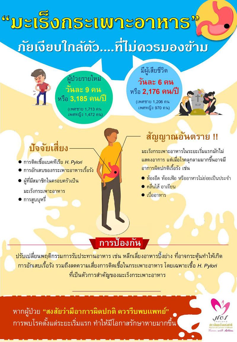 นายแพทย์สมศักดิ์ อรรฆศิลป์ อธิบดีกรมการแพทย์ กล่าวว่า มะเร็งกระเพาะอาหารเป็นมะเร็งที่พบมาก เป็นอันดับ 5 ของมะเร็งที่พบทั้งหมดทั่วโลก โดยทั่วโลกมีผู้ป่วยมะเร็งกระเพาะอาหารประมาณ 1 ล้านคน สำหรับประเทศไทยข้อมูลทะเบียนมะเร็งรายงานผู้ป่วยมะเร็งกระเพาะอาหารรายใหม่ปีละ 3,185 คน และในจำนวนนี้มีผู้เสียชีวิต 2,176 คน