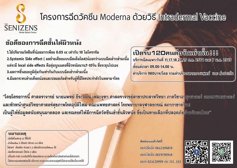 วันที่ 11 ธันวาคม 2564 นพ.ธีระวัฒน์ เหมะจุฑา ผู้อำนวยการศูนย์วิทยาศาสตร์สุขภาพโรคอุบัติใหม่ คณะแพทยศาสตร์ จุฬาลงกรณ์มหาวิทยาลัย โพสต์ข้อความผ่านเฟซบุ๊ก ธีระวัฒน์ เหมะจุฑา Thiravat Hemachudha ระบุว่า “มาฉีดวัคซีนโควิด โมเดอร์นา เข้าชั้นผิวหนัง ที่ รพ the Senizens เป็น รพ แรกที่ให้ทางเลือกกับคนไทยให้มีความปลอดภัยสูงสุด