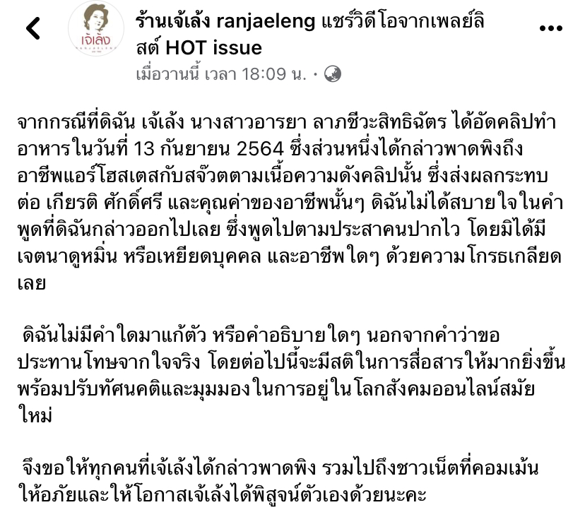 ล่าสุด วันนี้ (10 ธ.ค.) เพจ “ร้านเจ้เล้ง ranjaeleng” โพสต์ข้อความด้วยว่า “จากกรณีที่ดิฉัน เจ้เล้ง นางสาวอารยา ลาภชีวะสิทธิฉัตร ได้อัดคลิปทำอาหารในวันที่ 13 กันยายน 2564 ซึ่งส่วนหนึ่งได้กล่าวพาดพิงถึงอาชีพแอร์โฮสเตสกับสจ๊วตตามเนื้อความดังคลิปนั้น ซึ่งส่งผลกระทบต่อ เกียรติ ศักดิ์ศรี และคุณค่าของอาชีพนั้นๆ ดิฉันไม่ได้สบายใจในคำพูดที่ดิฉันกล่าวออกไปเลย ซึ่งพูดไปตามประสาคนปากไว โดยมิได้มีเจตนาดูหมิ่น หรือเหยียดบุคคล และอาชีพใดๆ ด้วยความโกรธเกลียดเลย