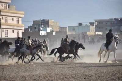 Buzkashi, meaning “goat grabbing”, is a centuries-old traditional game in Afghanistan, in which skilled horse riders of rival teams compete to take the slaughtered goat or calf and throw it in a circle fixed on the Buzkashi ground.