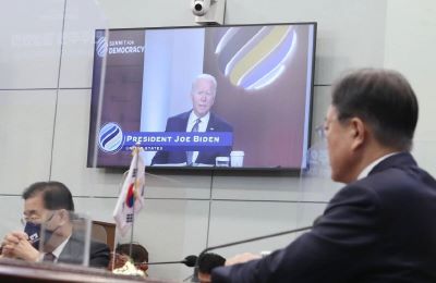 South Korean President Moon Jae-in on Thursday took part in a global democracy summit hosted by his US counterpart Joe Biden, and Foreign Minister Chung Eui-yong is set to join the meeting of G7 foreign ministers this week.