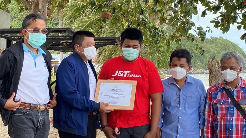 ต่อมาเมื่อวานนี้ (10 ธ.ค.64) นายบัญชา สุขแก้ว รองอธิบดีกรมประมง พร้อมด้วยนายพรศักดิ์ ศักดิ์ธานี ประมงจังหวัดนครศรีธรรมราช นายจิรโรจน์ สำแดง นายอำเภอขนอม และนายธานินทร์ ด่านสุวรรณ นายกสมาคมประมงขนอม ลงพื้นที่จังหวัดนครศรีธรรมราช ได้ร่วมกันมอบประกาศนียบัตรเพื่อประกาศเกียรติคุณให้แก่นายวายุ นวลกุล ว่าเป็นบุคคลตัวอย่างของการทำคุณประโยชน์ด้านการอนุรักษ์สัตว์ทะเลเลี้ยงลูกด้วยนม และเป็นแบบอย่างให้พี่น้องชาวประมงและประชาชนอย่างกว้างขวาง โดยกรมประมงมอบประกาศฯพร้อม เงิน 5,000บาทและนายกสมาคม จะมอบประกาศเชิดชูเกียรติ และเงินอีก 5,000 บาท