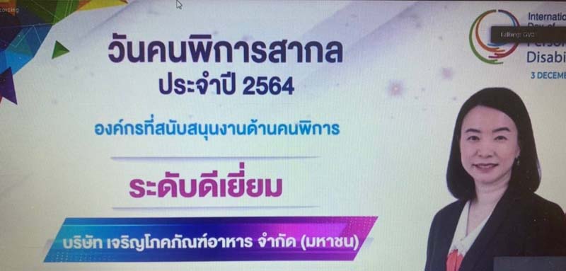 กระทรวงการพัฒนาสังคมและความมั่นคงของมนุษย์ (พม.) โดยกรมส่งเสริมและพัฒนาคุณภาพชีวิตคนพิการ มอบโล่ประกาศเกียรติคุณ องค์กรสนับสนุนคนพิการดีเด่น ระดับดีเยี่ยม แก่ บริษัท เจริญโภคภัณฑ์อาหาร จำกัด (มหาชน) หรือ ซีพีเอฟ และ บริษัทในกลุ่มรวม 13 บริษัท ในงานวันคนพิการสากล ปี 2564 โดยปีนี้ ซีพีเอฟรับรางวัลระดับดีเยี่ยมจากการเป็นองค์กรที่สนับสนุนงานคนพิการอย่างต่อเนื่อง 5 ปี โดยมพิมลรัตน์ รีพัฒนาวิจิตรกุล ประธานผู้บริหารทรัพยากรบุคคล ซีพีเอฟ นำคณะผู้บริหารเข้ารับโล่รางวัลจากพลเอกประยุทธ์ จันทร์โอชา นายกรัฐมนตรีในพิธีที่จัดขึ้นผ่านระบบการประชุมทางไกล (video conference) รางวัลที่ได้รับนี้สะท้อนถึงความมุ่งมั่นของซีพีเอฟในการยกระดับคุณภาพชีวิตและความเป็นอยู่ที่ดีขึ้นของคนพิการ หรือกลุ่มคนเปราะบางให้สามารถอยู่ร่วมในสังคมอย่างเสมอภาคและเท่าเทียม