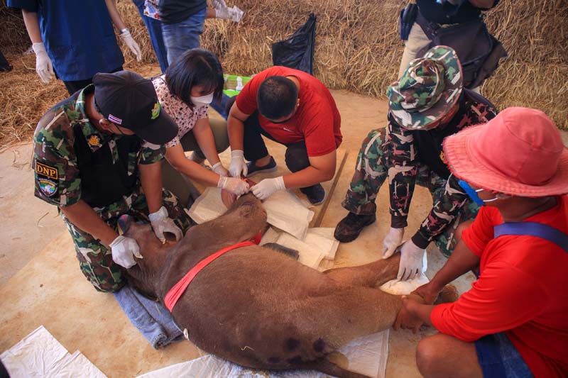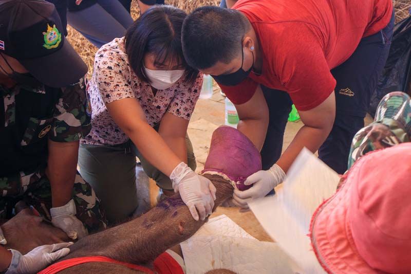 12 ธ.ค.64 นายกัมพล ตันสัจจา ประธานสวนนงนุช พัทยา พร้อมด้วยสัตวแพทย์หญิง (สพ.ญ.) สุนิตา วิงวอน สัตวแพทย์กรมอุทยานแห่งชาติสัตว์ป่าและพันธุ์พืช นายสัตวแพทย์เผด็จ ศิริดำรง ผู้อำนวยการโรงพยาบาลสัตว์เนินพลับหวานและสัตวแพทย์ประจำสวนนงนุช โดยมาดูอาการของ “พังฟ้าใส” ลูกช้างป่าเพศเมีย อายุ 3 เดือนที่บาดเจ็บจากการถูกบ่วงรัดและถูกยิง ซึ่งภายหลังที่ได้ทำการผ่าตัดเอากระสุนพังฟ้าใสออกแล้ว รวมถึงขาที่ได้เสริมลูกบอลเพื่อการลงน้ำหนัก พบว่าเริ่มมีอาการ อาการดีขึ้น แต่ยังมีอาการเจ็บปวดจากบาดแผลที่ได้รับการผ่าตัดอยู่ และต้องให้น้ำเกลือตลอดเวลา