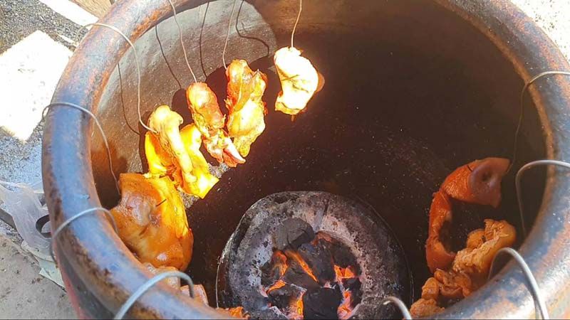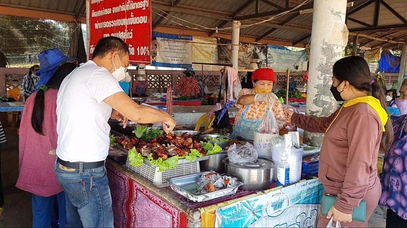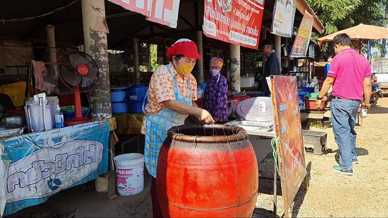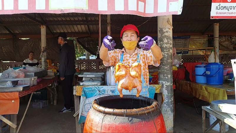 สภาพอากาศจังหวัดพะเยายังคงหนาวเย็นอย่างต่อเนื่อง ส่งผลให้แม่ค้าเกิดไอเดียทำอาหารแบบแปลกแวกแนว และเป็นจุดสนใจ ที่จะนำเสนอขายให้กับลูกค้าเช่นเดียวกับางสมมิตร ศรีวิชัย อายุ 58 ปี บ้านร้อง ต.ดงเจน อ.ภูกามยาว จ.พะเยา ได้มีแนวคิดดัดแปลงเอาโอ่งน้ำมาทำทาสีแดง เจาะก้นโอ่งใส่เตาอั่งโล้เผาถ่านแดงอบไก่ ขาย โดยใช้ชื่อร้านโอ่งแดง อบระเบิด อบไก่อบหมู ขาย และขายไก่อบ ราคาตัวละ 120 ขายดี ขายหมดทุกวัน ช่วงหน้าหนาวในตลาดบ้านร้องริมถนนสายพะเยา-ป่าแดด บ้านร้อง ต.ดงเจน อ.ภูกามยาว จ.พะเยา ถือว่าเป็นร้านโอ่งแดงระเบิดที่มีเพียงแห่งเดียวของจังหวัดพะเยา