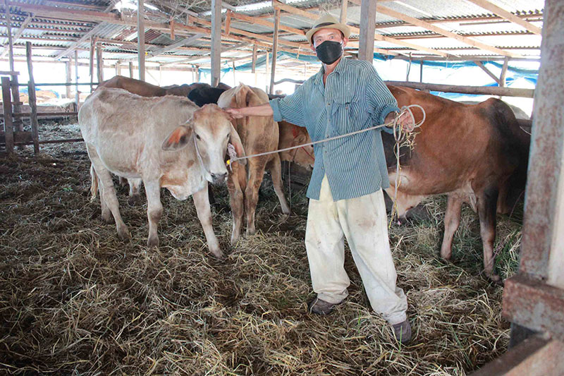 นายประเสริฐ นครชัย อายุ 58 ปี อยู่บ้านเลขที่ 155 หมู่ 4 บ้านโพนสวาง กล่าวว่า เดิมครอบครัวตนทำนา 9 ไร่ ปลูกอ้อย 10 ไร่ และปลูกมันสำปะหลัง 10 ไร่ ระยะหลังประสบปัญหาขาดทุน เนื่องจากปุ๋ยแพง ค่าแรงสูง บางปีฝนทิ้งช่วง ผลผลิตตกต่ำ ไม่คุ้มทุน ทำมากี่ปีๆก็ย่ำอยู่กับที่ เมื่อปี 2561 จึงคิดหาทางออกที่เหมาะสมกับสภาพพื้นที่และความชอบของตนเอง คือการเลี้ยงโคเนื้อ เนื่องจากเนื้อโคเป็นนิยมของผู้บริโภคตลอดปี และราคาซื้อขายเริ่มขยับสูงขึ้น เริ่มแรกตัดสินใจหาซื้อแม่โคลูกผสม สายพันธุ์บราห์มันที่กำลังตั้งท้องมา 5 ตัว เพื่อประหยัดเวลาในการเลี้ยงและเห็นผลผลิตเร็ว