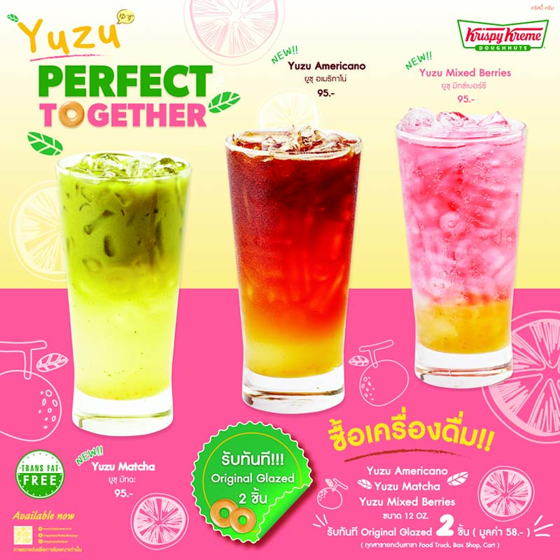 คริสปี้ ครีม ชวนชิมเครื่องดื่มใหม่ “Yuzu Perfect Together”เมนู 3 สไตล์ ยูซุ มิกซ์เบอร์รี่, ยูซุ มัทฉะ และยูซุ อเมริกาโน่ ราคาแก้วละ 95 บาท เมื่อซื้อ 1 แก้ว รับโดนัทคริสปี้ ครีม ออริจินัลเกลซ 2 ชิ้น ถึง 31 ม.ค. 2565