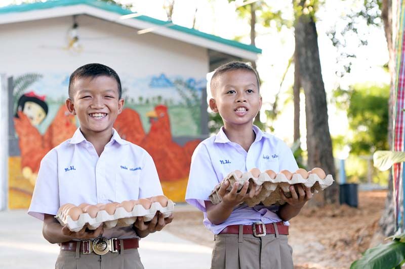 งานด้านเด็กและเยาวชน ได้ดำเนิน”โครงการเลี้ยงไก่ไข่เพื่ออาหารกลางวันนักเรียน” เป็นโครงการที่มูลนิธิฯร่วมสนับสนุนการดำเนินโครงการอาหารกลางวัน ในโครงการส่วนพระองค์ สมเด็จพระกนิษฐาธิราชเจ้า กรมสมเด็จพระเทพรัตนราชสุดาฯ สยามบรมราชกุมารี ด้วยการสนับสนุนการเลี้ยงไก่ไข่เพื่อนำไข่ไก่มาประกอบเป็นอาหารกลางวันของนักเรียนโรงเรียนตำรวจตระเวนชายแดนและขยายผลไปตามโรงเรียนในสังกัดสำนักงานคณะกรรมการการศึกษาขั้นพื้นฐาน(สพฐ.) และสังกัดอื่นทั่วประเทศ โดยมี บริษัท เจริญโภคภัณฑ์อาหาร จำกัด (มหาชน) หรือ ซีพีเอฟ หอการค้าญี่ปุ่น-กรุงเทพ และ บริษัท สยามแม็คโคร จำกัด (มหาชน) ร่วมสนับสนุนงบประมาณ ปัจจุบัน มีโรงเรียนที่เข้าร่วมโครงการฯ เกือบ 900 โรงเรียนทั่วประเทศ แต่ละโรงเรียนสามารถบูรณาการการเลี้ยงไก่ไข่สู่การเรียนการสอนและเป็นแหล่งเรียนรู้การจัดการอาชีพเกษตรเชิงธุรกิจสำหรับครู นักเรียน เกษตรกรรอบโรงเรียนรวมกว่า 1,900 ชุมชน เกิดการมีส่วนร่วมแก้ปัญหาภาวะทุพโภชนาการของเยาวชนจนถึงปัจจุบันรวมกว่า 180,000 คน นอกจากนี้ ยังมีโครงการสนับสนุนนักเรียนทุนในพระราชานุเคราะห์ ดูแลนักเรียนชั้นประถมศึกษาปีที่ 6 จากโรงเรียนตำรวจตระเวนชายแดนที่ร่วมโครงการเลี้ยงไก่ไข่เพื่ออาหารกลางวันนักเรียน ซึ่งมีความยากลำบาก และมีโอกาสน้อยในการเรียนต่อในระดับที่สูงขึ้น เนื่องจากอยู่ในพื้นที่ห่างไกล มูลนิธิฯ จึงร่วมสนับสนุนโครงการนักเรียนทุนในพระราชานุเคราะห์ สมเด็จพระกนิษฐาธิราชเจ้า กรมสมเด็จพระเทพรัตนราชสุดาฯ สยามบรมราชกุมารี รับเด็กที่มีความประพฤติดี ผลการเรียนดี มีความเป็นผู้นำจากโรงเรียน ตชด. พื้นที่ภาคตะวันออกเฉียงเหนือ มาพักค้างและเรียนต่อในระดับชั้นมัธยมศึกษาในโรงเรียนราชประชานุเคราะห์จังหวัดเลย และเด็กจากโรงเรียน ตชด. พื้นที่ภาคกลางและตะวันออก มาพักค้าง ณ ศูนย์ฝึกอาชีพเยาวชนเกษตร เพื่อเรียนต่อในระดับมัธยมศึกษา ณ โรงเรียนวังไกลกังวล ในพระบรมราชูปถัมภ์ ควบคู่กับการเรียนรู้ด้านอาชีพเกษตร ที่ผ่านมา มูลนิธิฯ รับเด็กเข้าโครงการรวม 203 คน จบการศึกษาแล้ว 97 คน อยู่ระหว่างการศึกษา 81 คน และกลับไปศึกษาหรือประกอบอาชีพใกล้บ้าน 25 คน และพบว่าร้อยละ 24 ของนักเรียนทุนได้กลับไปสร้างงาน สร้างอาชีพในครัวเรือน และร้อยละ 54 สามารถสร้างรายได้ให้กับตนเอง ขยายผลในการสร้างวิสาหกิจชุมชน