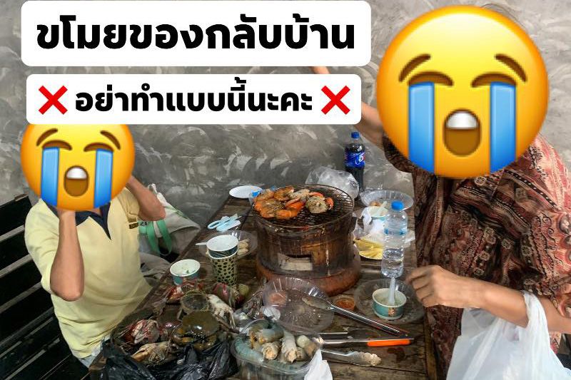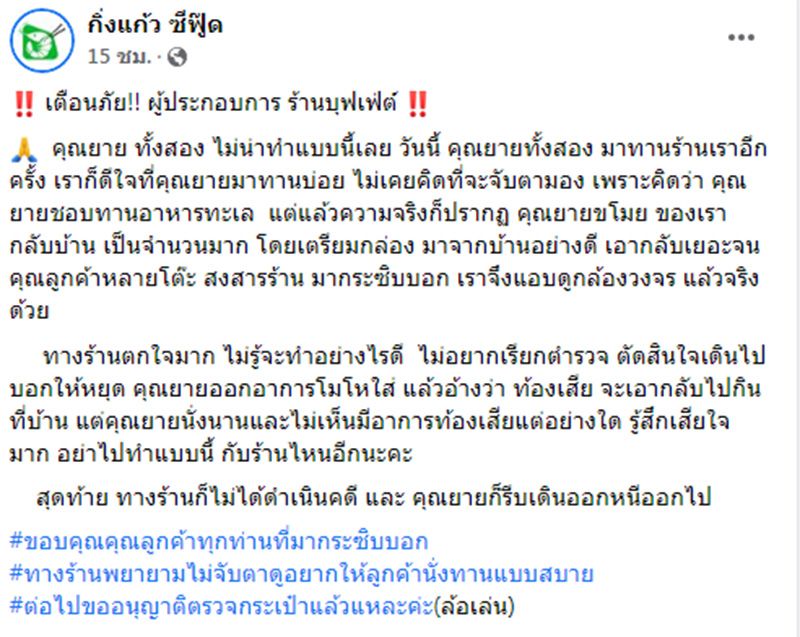 วันที่ 20 ธันวาคม 2564 เพจเฟซบุ๊ก กิ่งแก้ว ซีฟู๊ด ซึ่งเป็นร้านบุฟเฟ่ต์อาหารทะเลเผา ตั้งอยู่ถนนกิ่งแก้ว ต.ราชาเทวะ อ.บางพลี จ.สมุทรปราการ ได้โพสต์เตือนภัย ผู้ประกอบการร้านบุฟเฟ่ต์ ระบุว่า คุณยาย ทั้งสอง ไม่น่าทำแบบนี้เลย วันนี้ คุณยายทั้งสองมาทานร้านเราอีกครั้ง เราก็ดีใจที่คุณยายมาทานบ่อย ไม่เคยคิดที่จะจับตามอง เพราะคิดว่าคุณยายชอบทานอาหารทะเล แต่แล้วความจริงก็ปรากฏ คุณยายขโมยของเรากลับบ้านเป็นจำนวนมาก โดยเตรียมกล่องมาจากบ้านอย่างดี เอากลับเยอะจนคุณลูกค้าหลายโต๊ะสงสารร้านมากระซิบบอก เราจึงแอบดูกล้องวงจรแล้วจริงด้วย