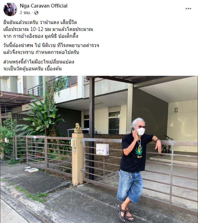“ยืนยันแล้วนะครับ ว่าน้าแดง เสียชีวิต เมื่อประมาณ 10-12 ชม มาแล้วโดยประมาณ จากการอ้างอิงของมูลนิธิป่อเต็กตึ๊ง วันนี้ต้องนำศพไปนิติเวชที่โรงพยาบาลตำรวจ แล้วจึงจะทราบ กำหนดการต่อไปครับ ส่วนพรุ่งนี้ถ้าไม่มีอะไรเปลี่ยนแปลง จะเป็นวัดคู้บอนครับ เบื้องต้น”