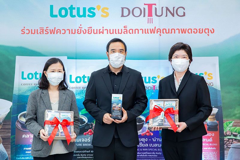 โลตัส จับมือโครงการพัฒนาดอยตุงฯ เปิดตัวกาแฟแท้คั่วบดคุณภาพแบรนด์โลตัส ผลิตโดยโครงการพัฒนาดอยตุงฯ มุ่งส่งเสริมเกษตรกรท้องถิ่นให้มีรายได้ สนับสนุนการเพาะปลูกที่ยั่งยืน พร้อมตอบโจทย์เทรนด์ผู้บริโภคยุคใหม่ที่มีไลฟ์สไตล์การชงกาแฟดื่มเองที่บ้าน ทั้งแบบดริป แบบเพรส และการใช้เครื่องชง ด้วยกาแฟแท้คั่วบด แบรนด์โลตัส 4 สูตร สูตรซิกเนเจอร์ อราบิก้า, สูตรคลาสสิก เบลนด์, สูตรดอยตุง-น่าน สเปเชียล เบลนด์, และสูตรดอยตุง-แม่สลอง สเปเชียล เบลนด์ ที่จุดเด่นอยู่ที่รสชาติและรสสัมผัสที่แตกต่างกัน และฐานกาแฟอราบิก้าแท้ 100% เอกลักษณ์ของเมล็ดกาแฟโครงการพัฒนาดอยตุงฯ ที่ปลูกใต้ร่มเงาป่าในจังหวัดเชียงราย