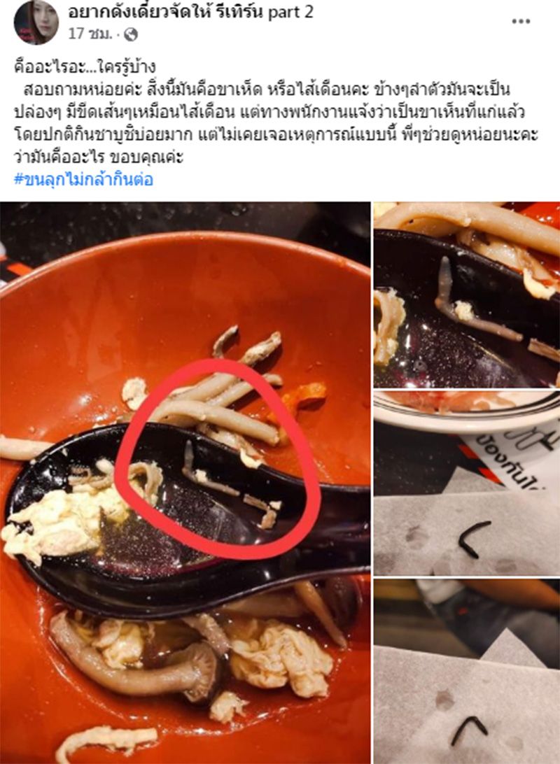 โดยโพสต์ดังกล่าว ระบุข้อความว่า “คืออะไรอะ…ใครรู้บ้าง สอบถามหน่อยค่ะ สิ่งนี้มันคือขาเห็ด หรือไส้เดือนคะ ข้างๆ ลำตัวมันจะเป็น ปล่องๆ มีขีดเส้นๆเหมือนไส้เดือน แต่ทางพนักงานแจ้งว่าเป็นขาเห็ดที่แก่แล้ว โดยปกติกินชาบูที่นี่บ่อยมาก แต่ไม่เคยเจอเหตุการณ์แบบนี้ พี่ๆ ช่วยดูหน่อยนะคะว่ามันคืออะไร ขอบคุณค่ะ #ขนลุกไม่กล้ากินต่อ -007