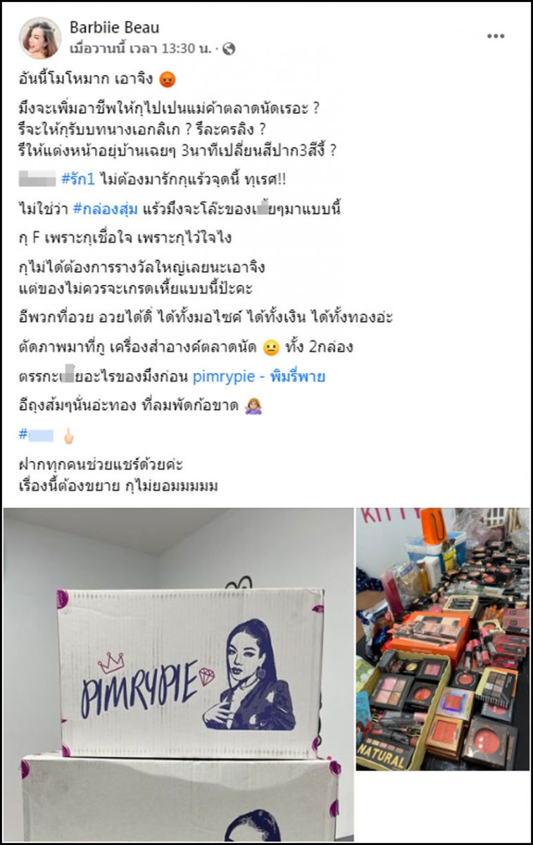 ล่าสุด ผู้ใช้เฟซบุ๊ก Barbiie Beau ได้โพสต์ภาพและข้อความฉุดจัด ร่ายยาวถึงแม่ค้าคนดังและสิ่งของที่เปิดมามีแต่เครื่องสำอางจำนวนมากและสร้อยทองเส้นเล็ก