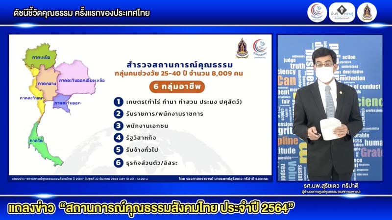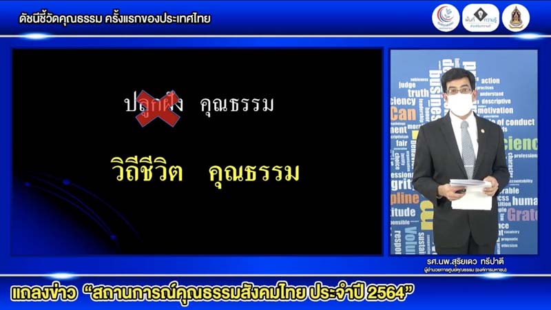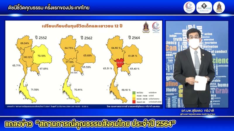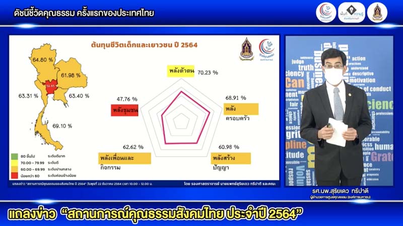 22 ธันวาคม 2564 ศูนย์คุณธรรม (องค์การมหาชน) แถลงข่าว “สถานการณ์คุณธรรมสังคมไทย ประจำปี 2564” โดย รศ.นพ.สุริยเดว ทรีปาตี ผู้อำนวยการศูนย์คุณธรรม (องค์การมหาชน) กล่าวว่า ศูนย์คุณธรรม ได้พัฒนาเครื่องมือและสำรวจสถานการณ์คุณธรรมด้วยตัวชี้วัดคุณธรรมของคนไทยวัยทำงาน ช่วงอายุ 25-40 ปี ใน 5 ด้าน คือ พอเพียง วินัย สุจริต จิตอาสา และกตัญญู กับกลุ่มเป้าหมาย 6 กลุ่มสาขาอาชีพ ได้แก่ เกษตร รับราชการ/พนักงานราชการ เอกชน รัฐวิสาหากิจ รับจ้างทั่วไป และธุรกิจส่วนตัว/อิสระ และได้จัดทำรายงานสถานการณ์คุณธรรมมาอย่างต่อเนื่อง โดยปี 2564 มีการสำรวจสถานการณ์ต้นทุนชีวิต (Life Asset) ของเด็กและเยาวชนไทย ช่วงอายุ 12-18 ปี ด้วยแบบสำรวจต้นทุนชีวิต ซึ่งประกอบไปด้วย 5 พลัง คือ พลังตัวตน พลังครอบครัว พลังสร้างปัญญา พลังเพื่อนและกิจกรรม และพลังชุมชน ซึ่งกลุ่มเป้าหมายที่สำรวจทั้งหมด จาก 6 ภูมิภาค ประกอบไปด้วย ภาคเหนือ ภาคตะวันออกเฉียงเหนือ ภาคตะวันตก ภาคกลาง