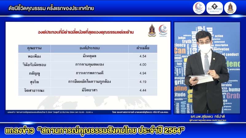 รศ.นพ.สุริยเดว กล่าวต่ออีกว่า สำหรับการสำรวจสถานการณ์คุณธรรมด้วยตัวชี้วัดคุณธรรมของคนไทยวัยทำงาน ช่วงอายุ 25-40 ปี ด้วยเครื่องมือที่ศูนย์คุณธรรมได้พัฒนาเป็นเครื่องมือแรกในประเทศไทย โดยสำรวจจากกลุ่มตัวอย่างประมาณ 8,000 คน 6 ภูมิภาค 6 สาขาอาชีพ ผลสำรวจออกมายังอยู่ในเกณฑ์ที่ใช้ได้ คือ ในระดับที่ดี ซึ่งเป็นเสียงของประชาชนที่สะท้อนออกมา จากผลสำรวจ พบค่าเฉลี่ยคุณธรรมของกลุ่มตัวอย่าง (จากค่าเฉลี่ยเต็ม 6.00) พบว่า ด้านความมีวินัยรับผิดชอบ เป็นค่าเฉลี่ยที่ต่ำที่สุด คือ อยู่ที่ค่าเฉลี่ย 4.18, ด้านสุจริต ค่าเฉลี่ย 4.49, ด้านความพอเพียง ค่าเฉลี่ย 4.61 และ ด้านจิตสาธารณะ ค่าเฉลี่ย 4.77 ตามลำดับ และเมื่อพิจารณาตัวบ่งชี้/องค์ประกอบที่มีค่าเฉลี่ยน้อยที่สุดของคุณธรรมแต่ละด้าน พบว่า ด้านความกตัญญู เรื่อง การเคารพความดี ค่าเฉลี่ยที่ 4.94, ด้านจิตสาธารณะ เรื่อง มีจิตอาสา ค่าเฉลี่ยที่ 4.44,