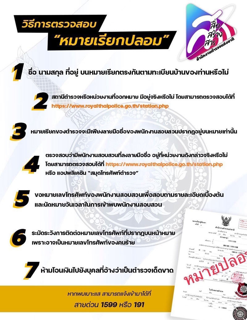 22 ธันวาคม 2564 เพจ “สำนักงานตำรวจแห่งชาติ” โพสต์ภาพ พร้อมข้อความ ระบุว่า “7 ขั้นตอนตรวจสอบ “หมายเรียกตำรวจปลอม” ระวังมิจฉาชีพสวมรอย ห้ามโอนเงิน เด็ดขาด!!!” #สำนักงานตำรวจแห่งชาติ #สื่อสร้างสาร