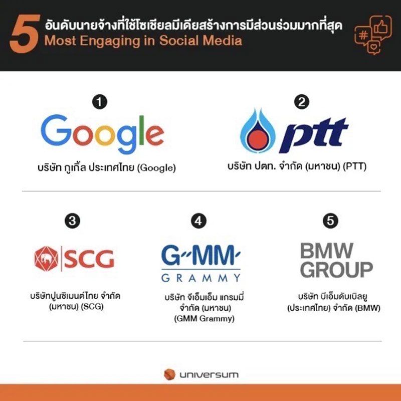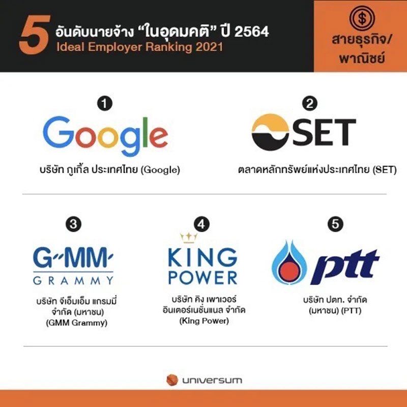 บริษัท จีเอ็มเอ็ม แกรมมี่ จำกัด (มหาชน) ยักษ์ใหญ่แห่งวงการบันเทิงเมืองไทยครองตำแหน่ง อันดับ 3นายจ้างในอุดมคติสายธุรกิจ/พาณิชย์ และยังติดอันดับ 4 ของนายจ้างที่ใช้โซเชียลมีเดีย สร้างการมีส่วนร่วมมากที่สุดจากข้อมูลเชิงลึกผลสำรวจ ประจำปี 2564 ของยูนิเวอร์ซัม (Universum) ผู้นำด้านการสร้างแบรนด์ประเภทองค์กรในระดับสากล ที่เปิดเผยข้อมูลเชิงลึกผลการสำรวจบุคคลผู้มีทักษะสูง ทั่วโลกฉบับประเทศไทย และตรวจสอบความต้องการด้านการทำงานของหนุ่มสาวรุ่นใหม่ที่จะเป็นแรงงาน ในอนาคต