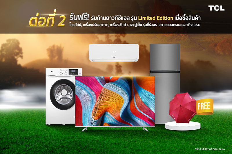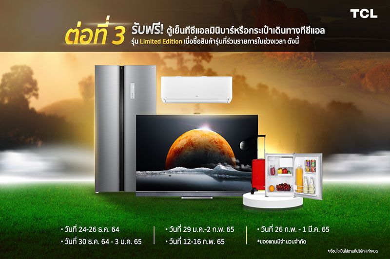 สำหรับต่อที่ 2 รับฟรีร่มก้านยาวทีซีแอล รุ่น Limited Edition เมื่อซื้อสินค้าที่ร่วมรายการ และต่อที่ 3 รับฟรีตู้เย็นทีซีแอลมินิบาร์หรือกระเป๋าเดินทางทีซีแอล รุ่น Limited Edition เมื่อซื้อสินค้ารุ่นที่ร่วมรายการในช่วงเวลาพิเศษ 5 ช่วง คือ วันที่ 24-26 ธันวาคม 2564 วันที่ 30 ธันวาคม 2564 ถึง 3 มกราคม 2565 วันที่ 29 มกราคม ถึง 2 กุมภาพันธ์ 2565 วันที่ 12-16 กุมภาพันธ์ 2565 และ วันที่ 26 กุมภาพันธ์ ถึง 1 มีนาคม 2565