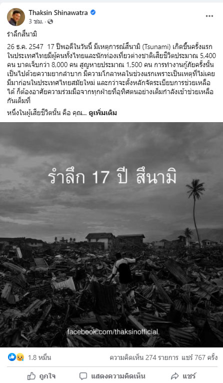 26 ธ.ค.64 นายทักษิณ ชินวัตร อดีตนายกรัฐมนตรี ได้โพสต์เฟซบุ๊กส่วนตัว Thaksin Shinawatra เพื่อรำลึกถึงเหตุการณ์สึนามิในวันที่ 26 ธ.ค. ปี 2547 ซึ่งปีนี้ถือว่าครบรอบ 27 ปีแล้ว ว่า “รำลึกสึนามิ 26 ธ.ค. 2547 17 ปีพอดีในวันนี้ มีเหตุการณ์สึนามิ (Tsunami) เกิดขึ้นครั้งแรกในประเทศไทยมีผู้คนทั้งไทยและนักท่องเที่ยวต่างชาติเสียชีวิตประมาณ 5,400 คน บาดเจ็บกว่า 8,000 คน สูญหายประมาณ 1,500 คน การทำงานกู้ภัยครั้งนั้นเป็นไปด้วยความยากลำบาก มีความโกลาหลในช่วงแรกเพราะเป็นเหตุที่ไม่เคยมีมาก่อนในประเทศไทยสมัยใหม่ และกว่าจะตั้งหลักจัดระเบียบการช่วยเหลือได้ ก็ต้องอาศัยความร่วมมือจากทุกฝ่ายที่อุทิศตนอย่างเต็มกำลังเข้าช่วยเหลือกันเต็มที่