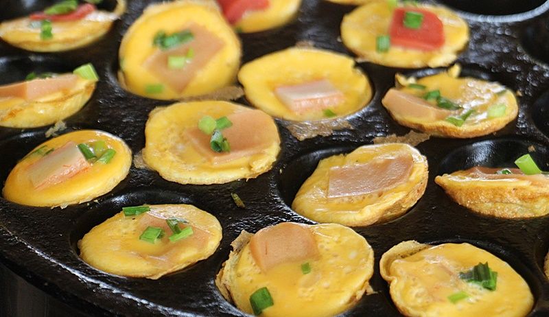 แต่จะมีขนมครกแปลกใหม่คือขนมครกไข่เสียบไม้ ที่ไม่ใช้แป้งแบบโบราณ แต่ใช้ไข่ไก่เป็นส่วนผสมหลักเอามาตีให้เข้ากัน ใส่ส่วนผสมเครื่องปรุงให้มีรสชาติดีอร่อย จากนั้นก็จะไปหยอดลงในเบ้าขนมครก เมื่อได้ที่จึงนำเนื้อปูอัด เนื้อหมูยอ ไส้กรอกหยอดลงไปบนหน้าขนมครก พอสุกได้ที่ก็ใช้ปลายช้อนแคะออกมาวางบนถาด เตรียมใส่กระทงขายได้ โดยจะมีกลิ่นหอมอ่อนๆ จากเครื่องปรุงรสและกลิ่นไข่ไก่โชยออกมาจากตัวขนม ทำให้มีนักท่องเที่ยวเกิดความสนใจได้สอบถามและแวะชิมกันอย่างคึกคัก ทำให้ขายดีกว่าขนมครกโบราณที่ขายอยู่ด้วย