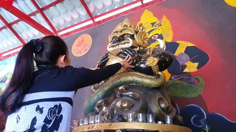 ทำให้บรรยากาศภายในบริเวณวัดตุ้มท่าคึกคักไปด้วยผู้คนที่เข้ามาเซ่นไหว้ขอพรพระราหู ซึ่งการเซ่นไหว้พระราหูในวันนี้ตรงกับวันพุธจะนำของดำ 8 อย่างมาเซ่นไหว้ ราหู ตามความเชื่อที่สืบทอดกันมาตั้งแต่โบราณกาล จนถึงปัจจุบัน หากใครได้เซ่นไหว้ในวันนี้ก็จะทำให้มีความเป็นสิริมงคลกับตนเองและครอบครัวตลอดจนโชคลาภ อีกทั้งยังเป็นการขอ พร ราหูอมจันทร์ ส่งท้ายปีเก่าต้อนรับปีใหม่ 65 นี้ – 003