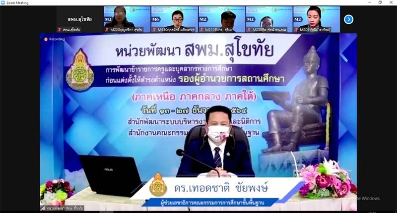 ดร.เทอดชาติ ชัยพงษ์ ผู้ช่วยเลขาธิการคณะกรรมการการศึกษาขั้นพื้นฐาน ลงพื้นที่ตรวจเยี่ยมให้กำลังใจและมอบเกียรติบัตรให้กับคณะทำงานหน่วยพัฒนาข้าราชการครูและบุคลากรทางการศึกษาก่อนแต่งตั้งให้ดำรงตำแหน่งรองผู้อำนวยการสถานศึกษา สังกัดสำนักงานคณะกรรมการการศึกษาขั้นพื้นฐาน (สพฐ.)ในเขตภาคเหนือ ภาคกลาง และภาคใต้ รูปแบบออนไลน์ ณ หน่วยพัฒนา สำนักงานเขตพื้นที่การศึกษามัธยมศึกษาสุโขทัย