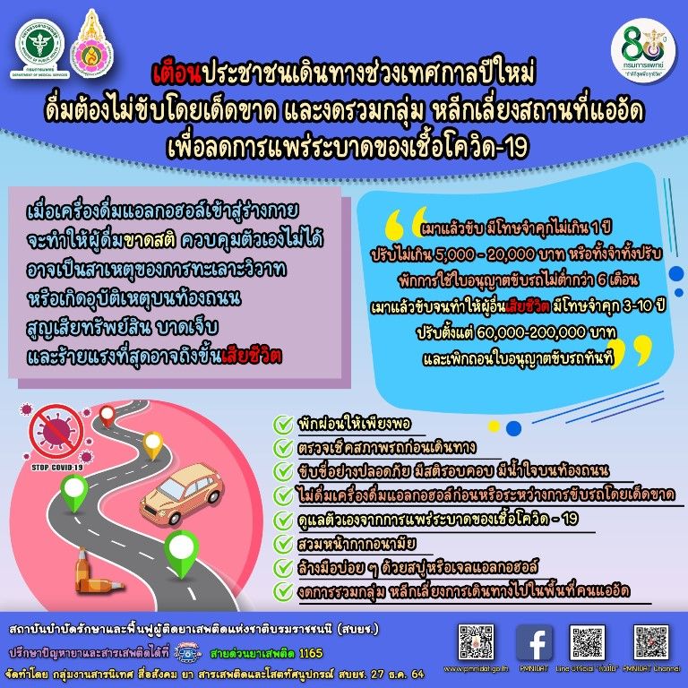 สถาบันบำบัดรักษาและฟื้นฟูผู้ติดยาเสพติดแห่งชาติบรมราชชนนี (สบยช.) กรมการแพทย์ เตือนประชาชนเดินทางกลับภูมิลำเนาหรือท่องเที่ยวช่วงเทศกาลปีใหม่ ดื่มต้องไม่ขับขี่ยานพาหนะโดยเด็ดขาด งดการรวมกลุ่ม หลีกเลี่ยงการเดินทางไปในสถานที่แออัด เพื่อลดการแพร่ระบาดของเชื้อโควิด 19
