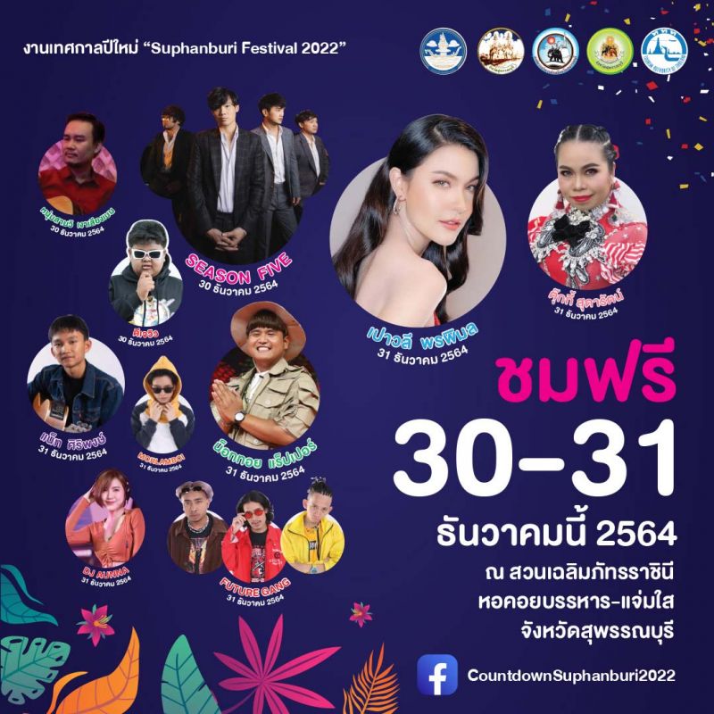 จังหวัดสุพรรณบุรี ร่วมกับ การท่องเที่ยวแห่งประเทศไทย (ททท.) พร้อมด้วย องค์การบริหารส่วนจังหวัดสุพรรณบุรี เทศบาลเมืองสุพรรณบุรี กระทรวงการท่องเที่ยวและกีฬา กระทรวงทรัพยากรธรรมชาติและสิ่งแวดล้อม สวนเฉลิมภัทรราชินี และหน่วยงานภาครัฐและเอกชน เชิญชวนพี่น้องชาวสุพรรณบุรีและนักท่องเที่ยวร่วมฉลองนับถอยหลังปีใหม่ ส่งท้ายปีเก่า ต้อนรับปีใหม่ ในงาน “Countdown Suphanburi Happy Healthy 2022” ณ บริเวณสวนเฉลิมภัทรราชินี หอคอยบรรหารแจ่มใส อำเภอเมือง จังหวัดสุพรรณบุรี ในระหว่างวันที่ 30 – 31 ธันวาคม 2564