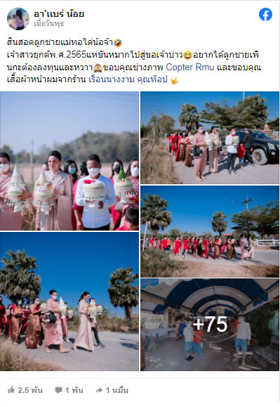 โดยเฟซบุ๊ก “อา’เเบร่ น้อย” ได้เล่าเรื่องราวผ่านเฟซบุ๊กระบุข้อความว่า “สินสอดลูกชายแม่ทอได่น้อจ้า เจ้าสาวยุค พ.ศ.2565 แห่ขันหมากไปสู่ขอเจ้าบ่าว อยากได้ลูกชายเพินกะต้องลงทุนและหวา ขอบคุณช่างภาพ Copter Rmu และขอบคุณเสื้อผ้าหน้าผมจากร้าน เรือนนางงาม คุณท๊อป”