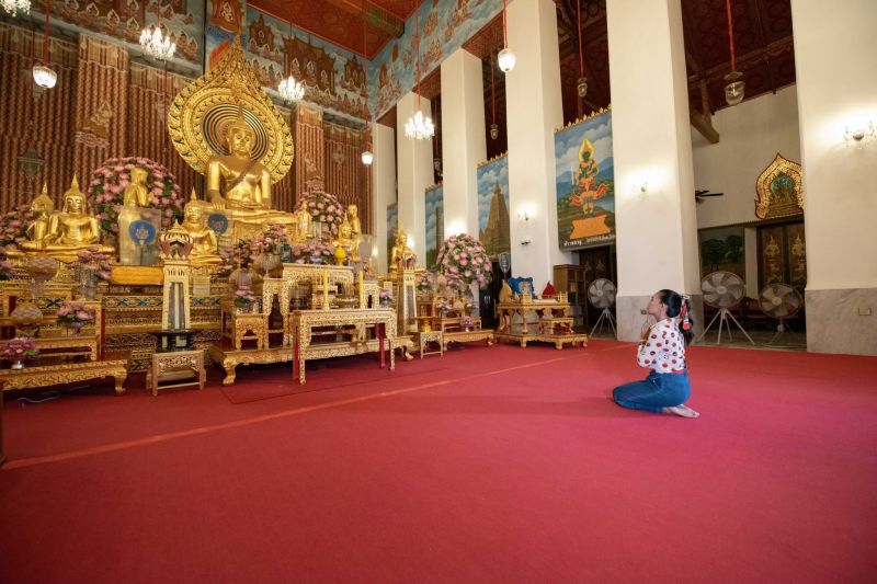 พระมหาเจดีย์พระพุทธเจ้าหนึ่งหมื่นพระองค์ ภายในประดิษฐาน “พระแม่กวนอิมมหาโพธิสัตว์ (อวโลกิเตศวร) พันกรพันเนตร แกะสลักด้วยไม้จันทน์หอมจากประเทศจีน มี 4 ทิศ 20 พระพักตร์ เป็นสิ่งศักดิ์สิทธิ์ในย่านโชคชัย 4 วิธีไหว้ขอพรให้จุดธูป เทียน กำยาน พร้อมของบูชา 4 ชุด สำหรับการไหว้ทั้ง 4 ทิศ เพื่อให้แต่ละทิศปกป้องคุ้มครองเรา เดินวนซ้ายไหว้ทีละทิศ รวมทั้งถวายผ้าบูชาและเติมน้ำมันตะเกียง มีเคล็ดลับก่อนไปถึงพระแม่กวนอิมองค์ที่ 4 ปางประทานบุตรใครอยากลูกให้ตั้งจิตอธิษฐานขอได้เลย และเมื่อไหว้ครบทุกทิศแล้ว จะมีเหรียญเซต 110 เหรียญ ให้นำมาหยอดถังที่เป็นหัวใจของพระแม่กวนอิม จะทำให้จิตใจอยู่กับตัวเอง เสริมสร้างมงคล ส่วนอีก 2 เหรียญนำไปใส่โอ่งทองคำ ตามความเชื่อว่าเป็นการขอสมบัติ จากนั้นแนะนำให้ไปเคาะระฆังและตีกลองด้านใน เพื่อให้ทำอะไรก็มีแต่ชัยชนะ