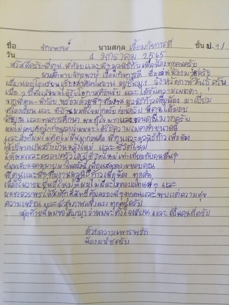 รายงานความคืบหน้า บ้านน้องมาร์ช เด็กชายจักรพงษ์ เอื้อมกิจการดี ที่ได้รับความเมตตา และได้รับการช่วยเหลือ ได้รับโอกาสดีๆในชีวิตเหมือนคนอื่นๆ จากพี่ตูน บอดี้สแลม พร้อมด้วยคณะทีมงานมูลนิธิก้าวคนละก้าว(ก้าวเพื่อน้อง)ขณะนี้บ้านที่สร้างมีความคืบหน้า80 % แล้ว และเนื่องในวาระดิถีขึ้นปีใหม่ 2565 และวันเด็กแห่งชาติที่จะมาถึงนี้ โรงเรียนเชียงสาศิลปสถาน ผู้บริหาร คณะครู บุคลากร พร้อมด้วยนักเรียนทุกคน ขออาราธนาสิ่งศักดิ์ในสากลโลกนี้ได้ดลบันดาลให้พี่ตูน พี่ก้อย พร้อมทั้งคณะทีมงานก้าวคนละก้าวทุกท่านจงประสบแต่ความสุข ความเจริญ ด้วยวรรณะ สุขะ พละ ด้วยเทอญขอขอบพระคุณทุกภาคส่วนเป็นอย่างสูงที่ให้ความช่วยเหลือ และให้โอกาสเด็กที่มีฐานะยากจนได้มีโอกาสศึกษาต่ออย่างเท่าเทียมกัน ขอผลบุญที่ทุกๆท่านได้กระทำจงส่งผลให้ท่านประสบแต่ความสุข ความเจริญในหน้าที่การงานตลอดไป #มูลนิธิก้าวคนละก้าว ก้อย-ตูน koytoonfamily เครดิตภาพบางส่วนจาก:กสศ.กองทุนเพื่อความเสมอภาคทางการศึกษานี่เป็นเพียงส่วนหนึ่งของน้ำใจที่ให้โดยตั้งใจของ ตูน บอดี้สแลม ที่มีปณิธานตั้งมั่นว่าจะยืนอยู่เคียงข้างทุกคนด้วยความจริงใจและมุ่งหวังให้ทุกคนในสังคมได้มีรอยยิ้ม w014