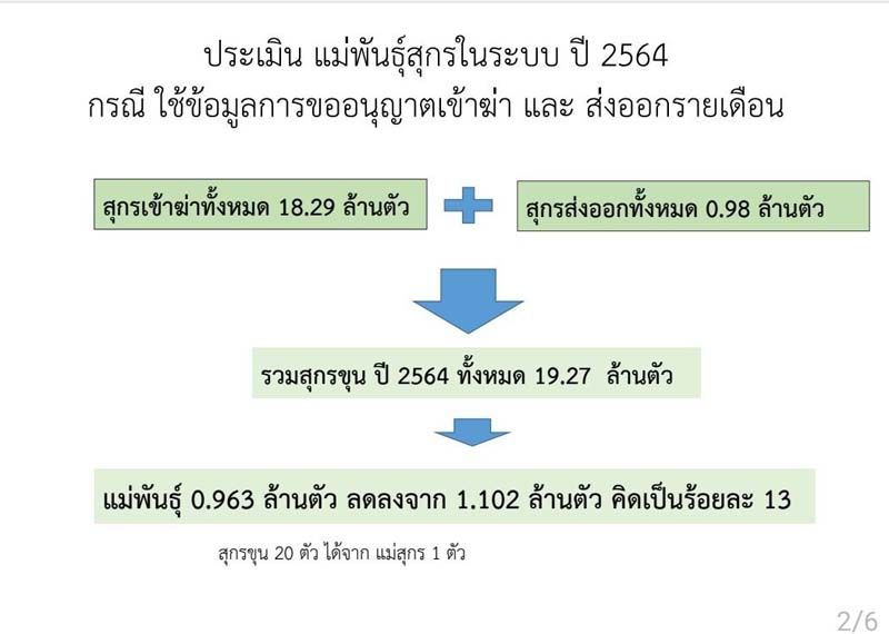 อย่างไรก็ตาม จากการประเมินจำนวนสุกรทั้งประเทศในปี 2564 ในการตรวจสอบจากการขออนุญาตเข้าฆ่าและส่งออก พบว่า รวมสุกรขุนทั้งประเทศ 19.27 ล้านตัว แบ่งเป็น สุกรเข้าฆ่า 18.29 ล้านตัวและส่งออก 0.98 ล้านตัว หรือลดลงร้อยละ 13