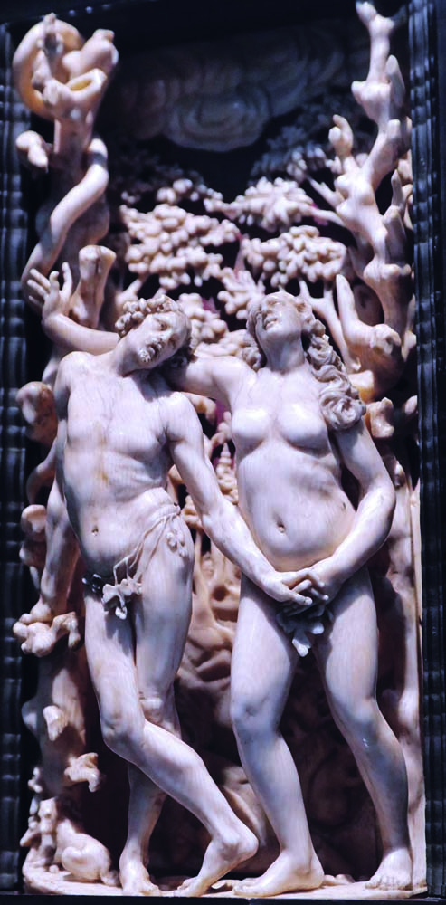 งาหรือฟันของสัตว์เป็นอีกวัสดุหนึ่งที่คนโบราณนำมาแกะสลัก ในช่วงต้นๆ ของประวัติศาสตร์มนุษย์ใช้ฟันสัตว์มาตกแต่งร่างกายจวบชาวยุโรปเดินทางไปถึงแอฟริกา พวกเขาก็ได้นำงาหรือฟันของสัตว์ใหญ่ซึ่งเป็นของหายากและราคาแพงกลับมาทวีปยุโรปเพื่อทำของตกแต่งและสร้างสรรค์งานศิลปะ เนื่องจากงาของสัตว์มีความคงทนถาวรกว่าไม้จึงกลายเป็นวัสดุสำคัญที่สุดที่ใช้สร้างงานศิลปะตั้งแต่ยุคกลาง งาช้างกลายเป็นวัสดุสำคัญของการสร้างงานศิลปะยุโรปในคริสต์ศตวรรษที่ 17-18 อันเป็นผลมาจากการแข่งขันกันระหว่างเยอรมันและเนเธอร์แลนด์ ผลงานส่วนใหญ่เกิดขึ้นจากการค้าระหว่างประเทศส่งผลให้เกิดความมั่งคั่งและช่างฝีมือสังเกตได้จากความละเอียดอ่อนของผลงานโดยเฉพาะใบไม้และเถาองุ่นจากชิ้นงาน Adam and Eve ที่จัดแสดงใน Museum of Fine Arts Budapest