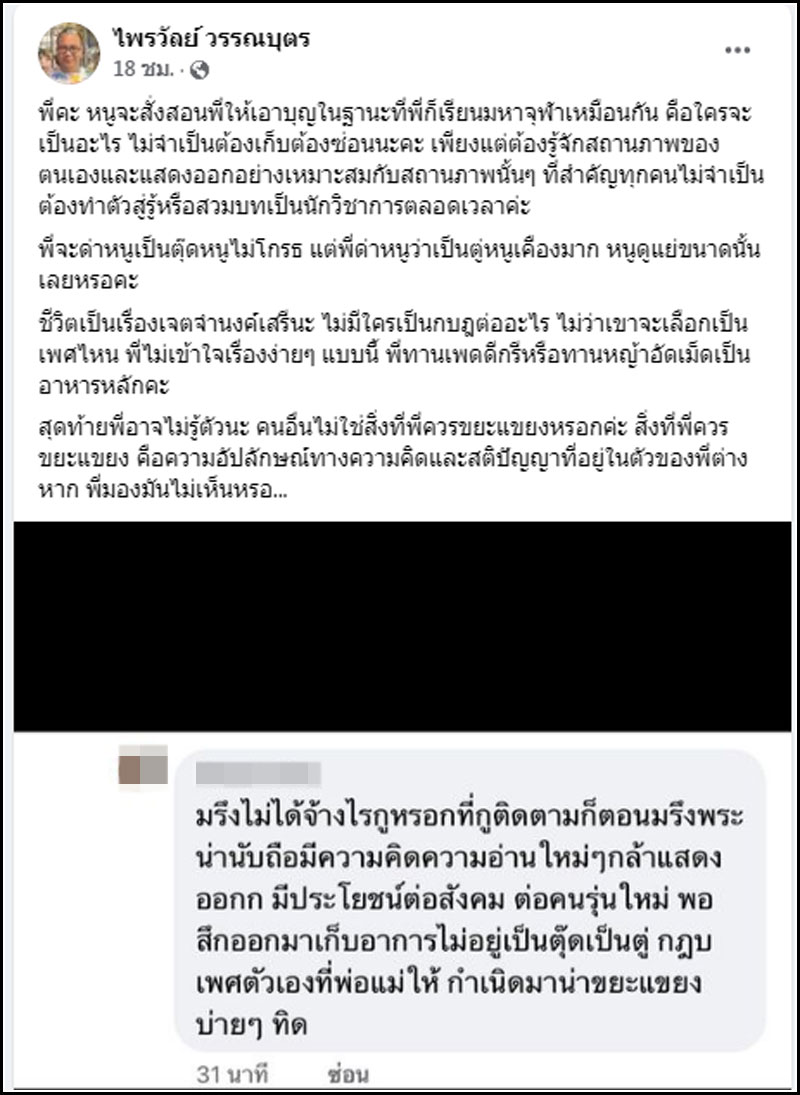 ทำเอา ทิดไพรวัลย์ ต้องออกมาโพสต์ข้อความร่ายยาวตอกกลับชาวเน็ต ถึงกรณีพาดพิงเพศสภาพ โดยระบุว่า