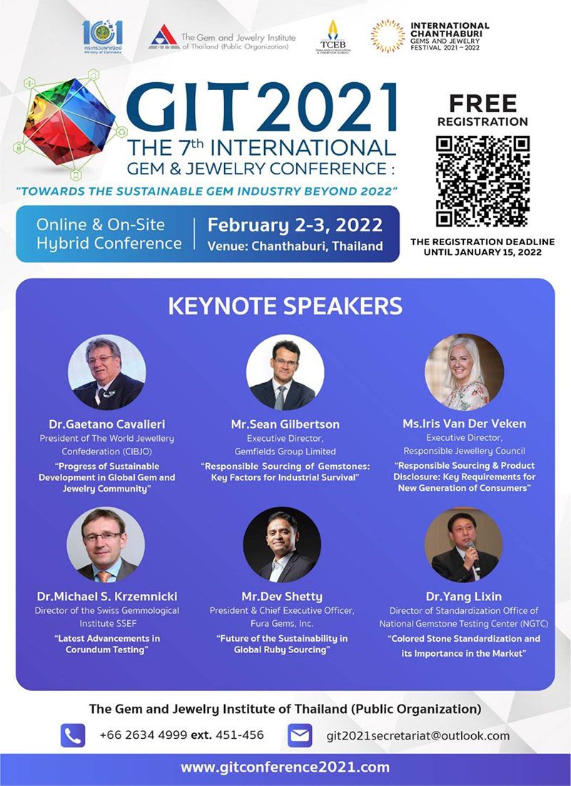 นายสุเมธ ประสงค์พงษ์ชัย ผู้อำนวยการสถาบันวิจัยและพัฒนาอัญมณีและเครื่องประดับแห่งชาติ หรือ GIT เปิดเผยถึงการประชุมวิชาการนานาชาติด้านอัญมณีและเครื่องประดับ ครั้งที่ 7 (The 7thInternational Gem & Jewelry Conference” (GIT 2021) ที่จะจัดขึ้นระหว่างวันที่ 2-3 กุมภาพันธ์ 2565 ณ โรงแรมมณีจันท์รีสอร์ท จังหวัดจันทบุรี ซึ่งถือเป็นศูนย์กลางการผลิตและปรับปรุงคุณภาพพลอยสี และเป็นแหล่งการค้าพลอยสีที่สำคัญที่สุดของประเทศ ในแต่ละปีจะมีอัญมณีพลอยสีกว่า 80% ของโลก ส่งมาเพื่อปรับปรุงคุณภาพและเจียระไน ที่ประเทศไทย โดยเฉพาะที่จังหวัดจันทบุรี ทำให้จังหวัดจันทบุรี ขึ้นชื่อว่าเป็นนครอัญมณี เป็นที่ยอมรับในระดับสากล