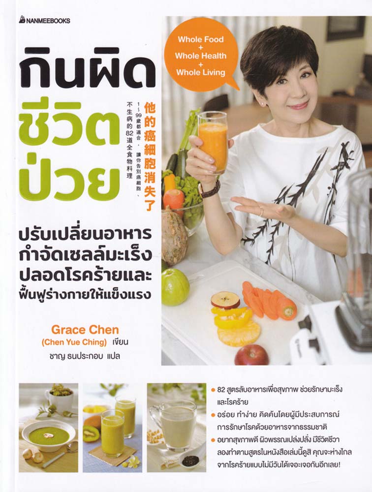 หนังสือ ‘กินผิด ชีวิตป่วย’ผู้เขียน Chen Yue Ching ผู้แปล ชาญ ธนประกอบ ในปัจจุบัน คนจำนวนร้อยละ 70 ตกอยู่ในภาวะพร่องสุขภาพ ร่างกายอักเสบระยะยาว ซึ่งเป็นความเสี่ยงที่จะเป็นมะเร็งโดยไม่รู้ตัว “เฉินเยชิง” ผู้มีประสบการณ์ด้านการรักษาด้วยอาหารมากว่า 30 ปีพิสูจน์แล้วว่าอาหารเพียง 1 มื้อสามารถเปลี่ยนแปลงชีวิตของคนเราได้ แค่นำวัตถุดิบมาปรุงด้วยความพิถีพิถัน ปรับฤทธิ์ร้อนและเย็นของวัตถุดิบให้สมดุลเพื่อไม่ให้เป็นอันตรายต่อสุขภาพ ในเล่มมีสูตรอาหารสุขภาพ 82 สูตร พร้อมทั้งสอดแทรกเรื่องราวของคนที่เคยรักษาโรคด้วยเมนูดังกล่าวแล้วหายป่วย เกร็ดความรู้และหลักการกินสำหรับโรคต่างๆ เรื่องราวจากผู้ป่วยมะเร็ง สูตรอาหารนี้ เหมาะสำหรับผู้ป่วยโรคร้ายแรงอย่างมะเร็ง คนธรรมดาที่มักเจ็บป่วยออด ๆ แอด ๆ หรือเป็นผู้รักสุขภาพก็สามารถรับประทาน หนังสือราคาเล่มละ 375 บาท