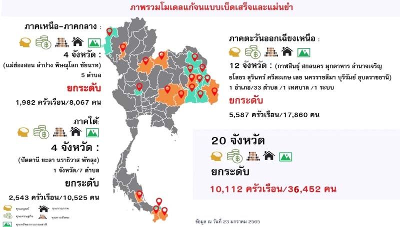 แบ่งเป็นจำนวน 10 จังหวัดในปี 2563 ประกอบด้วย ปัตตานี อำนาจเจริญ แม่ฮ่องสอน ชัยนาท สุรินทร์ ยโสธร ศรีสะเกษ สกลนคร มุกดาหาร กาฬสินธุ์ และ 10 จังหวัด ในปี 2564 ได้แก่ บุรีรัมย์ นราธิวาส อุบลราชธานี ลำปาง พัทลุง นครราชสีมา ร้อยเอ็ด พิษณุโลก เลย และยะลา ทั้งนี้ จากระบบการสอบทานอย่างละเอียด พบข้อมูลคนยากจน 7.8 แสนคน เพื่อส่งต่อเข้าระบบความช่วยเหลือขององค์กรภาครัฐ