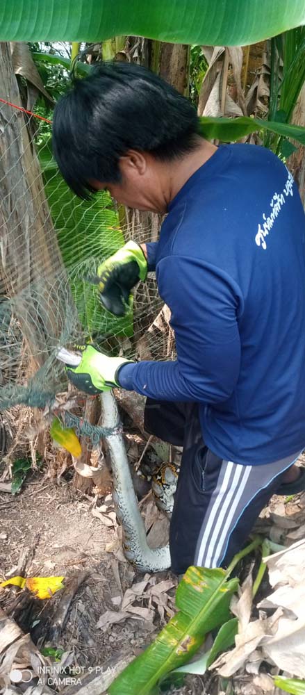 สอบถามนางอำนวย เล่าว่า ช่วงใกล้เที่ยงตนนำอาหารมาให้ไก่ตามปกติ แต่วันนี้ที่เล้าไก่ไม่ปกติ เพราะมีงูเหลือมถูกตาข่ายพันหัว พันลำตัวจนแน่น ด้วยความสงสารเกรงว่างูเหลือมจะถูกตาข่ายพันประกอบกันอากาศร้อนจัด และจุดที่งูเหลือมติดตาข่ายมีแสงแดดส่อง งูเหลือมอาจถูกแสงแดดเผาจนตายได้ จึงแจ้งเจ้าหน้าที่กู้ภัยช่วย. -008