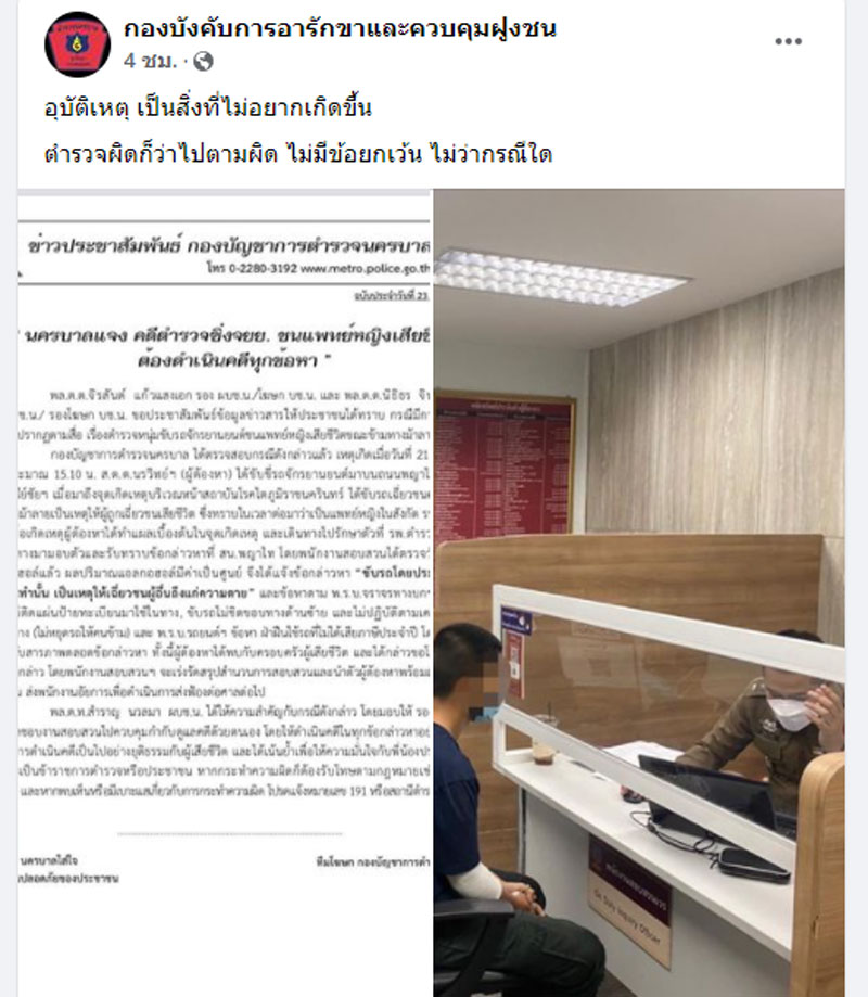 23 ม.ค.65 เพจเฟซบุ๊ก “กองบังคับการอารักขาและควบคุมฝูงชน” แชร์โพสต์ “กองสารนิเทศ สำนักงานตำรวจแห่งชาติ” ได้โพสต์ข้อความและภาพว่า “นครบาลแจงคดีตำรวจซิ่งจยย.ชนแพทย์หญิงเสียชีวิต”