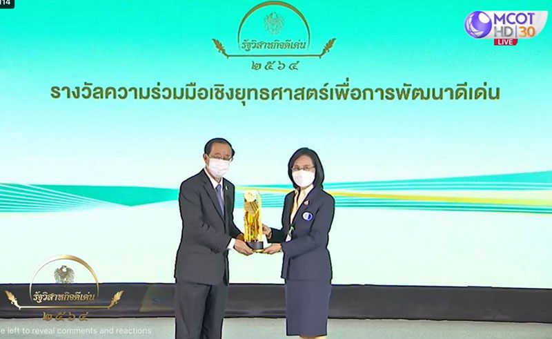อาคม เติมพิทยาไพสิฐ รัฐมนตรีว่าการกระทรวงการคลัง ประธานในพิธีมอบรางวัลรัฐวิสาหกิจดีเด่น ประจำปี 2564 ภายใต้แนวคิด “ก้าวสู่วิถีใหม่ด้วยพลังรัฐวิสาหกิจไทยอย่างยั่งยืน” มอบรางวัลความร่วมมือเชิงยุทธศาสตร์เพื่อการพัฒนาดีเด่น (ประเภทดีเด่น)ให้แก่ ศ.(วิจัย) ดร.ชุติมา เอี่ยมโชติชวลิตผู้ว่าการสถาบันวิจัยวิทยาศาสตร์และเทคโนโลยี (วว.) กระทรวงการอุดมศึกษา วิทยาศาสตร์วิจัยและนวัตกรรม (อว.) ซึ่งเป็นความสำเร็จในการบูรณาการดำเนินงานร่วมกันระหว่าง วว. ธนาคารเพื่อการเกษตรและสหกรณ์การเกษตร (ธ.ก.ส.) และธนาคารเพื่อการส่งออกและนำเข้าแห่งประเทศไทย (EXIM Bank) ภายใต้โครงการส่งเสริมศักยภาพและสนับสนุนผู้ประกอบการวิสาหกิจขนาดกลางและขนาดย่อม (SMEs)(ในวันจันทร์ที่ 31 มกราคม 2565 ณ ตึกสันติไมตรีทำเนียบรัฐบาล)