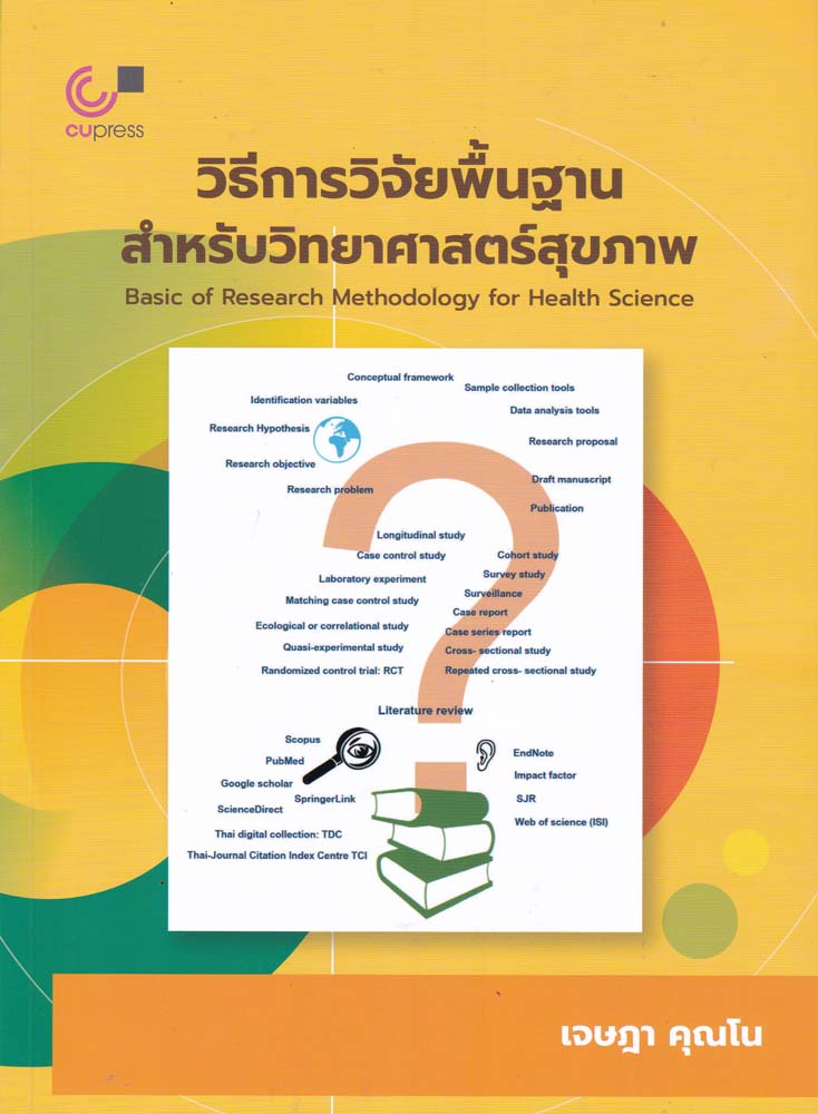 หนังสือ “วิธีวิจัยพื้นฐานสำหรับวิทยาศาสตร์สุขภาพ” ผู้เขียน ดร.เจษฎา คุณโน อาจารย์ คณะแพทยศาสตร์วชิรพยาบาล มหาวิทยาลัยนวมินทราธิราช เป็นคู่มือในการออกแบบวิธีการวิจัยพื้นฐานสำหรับวิทยาศาสตร์สุขภาพ ที่นำเสนอหลักการวิจัย กระบวนการวิจัย และวิธีการวิจัยทั้งหมด 14 วิธี โดยการเลือกวิธีวิจัยเป็นส่วนที่สำคัญมากในการทำวิจัยเพราะใช้ในการตอบโจทย์ปัญหาวิจัยที่สนใจศึกษาโดยมีวิธีการครอบคลุมหลายๆ เทคนิคและเป็นอีกหนึ่งเครื่องมือในการคัดกรองกลุ่มประชากรตัวอย่างที่จะเข้าร่วมวิจัยอีกด้วย โดยได้ชี้แนะคุณลักษณะ ข้อดี ข้อเสีย ตัวอย่างในแต่ละวิธีการวิจัยอย่างชัดเจน และยังได้นำเสนอหลักการทำวิจัยตั้งแต่เริ่มต้นจนถึงการตีพิมพ์ผลงานวิจัย นอกจากนี้ผู้เขียนยังมองเห็นความสำคัญของการสืบค้นข้อมูลจากฐานข้อมูลต่างๆ ได้อย่างเป็นระบบ และได้นำเสนอการจัดเก็บข้อมูลเอกสารอ้างอิงโดยใช้โปรแกรม EndNote เพื่อเป็นประโยชฯในการรวบรวมข้อมูลอีกด้วย ราคาเล่มละ 290 บาท