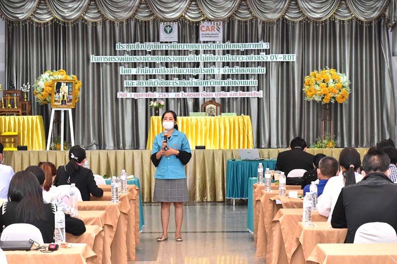 ที่โรงแรมชาร์ลอง บูทรีค อ.เมือง จ.กาฬสินธุ์ สำนักงานป้องกันควบคุมโรคที่ 7 ขอนแก่น และสถาบันวิจัยมะเร็งท่อน้ำดี มหาวิทยาลัยขอนแก่น จัดประชุมเชิงปฏิบัติการพัฒนาบุคลากรในพื้นที่ เขตสุขภาพที่ 7 ในการตรวจคัดกรองด้วยชุดตรวจพยาธิใบไม้ตับจากปัสสาวะอย่างเร็ว OV-RDT โดยมี นพ.สมาน ฟูตระกูล ผู้อำนวยการสำนักงานป้องกันควบคุมโรคที่ 7 เป็นประธานในพิธีเปิด กิจกรรมดังกล่าวมีบุคลากรเจ้าหน้าที่สาธารณสุขจากภาคส่วนต่างๆ เข้าร่วมจำนวนกว่า 120 คน