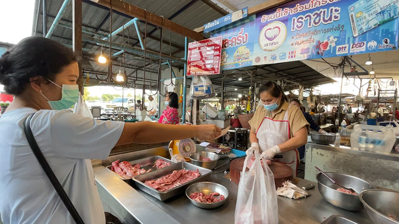 ชาวบ้านรายหนึ่ง เดินทางไปซื้อหมูในช่วงที่ราคากำลังปรับลดลงเช้าวันนี้ ที่ตลาดสดเทศบาลเมืองเลย ทำให้บรรยากาศที่เคยเงียบเหงาก็กลับมาคึกคักบ้าง แต่เมื่อมีการซื้อขายเสร็จและมีการจ่ายเงินผ่านโครงการคนละครึ่ง โดยใช้แอพเป๋าตัง