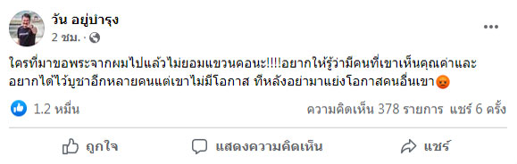 1 ก.พ.65 นายวัน อยู่บำรุง ส.ส.กทม.พรรคเพื่อไทย โพสต์เฟศบุ๊กส่วนตัว “วัน อยู่บำรุง” ระบุข้อความว่า “ใครที่มาขอพระจากผมไปแล้วไม่ยอมแขวนคอนะ!!!!อยากให้รู้ว่ามีคนที่เขาเห็นคุณค่าและอยากได้ไว้บูชาห้อยคออีกหลายคนแต่เขาไม่มีโอกาส ทีหลังอย่ามาแย่งโอกาสคนอื่นเขา” .-008