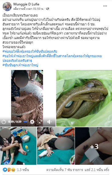 โดยระบุข้อความว่า “เป็นบทเรียนจนวันตายเลย อย่าเอาแผ่นหิน แผ่นปูนมาวางไว้ในบ้านกันน่ะครับ สัตว์มีพิษจะเข้าไปอยู่ อันตรายมาก โดยเฉพาะกับเด็กเล็กและคนแก่ จนตอนนี้ผ่านมา 6 ชั่วโมง