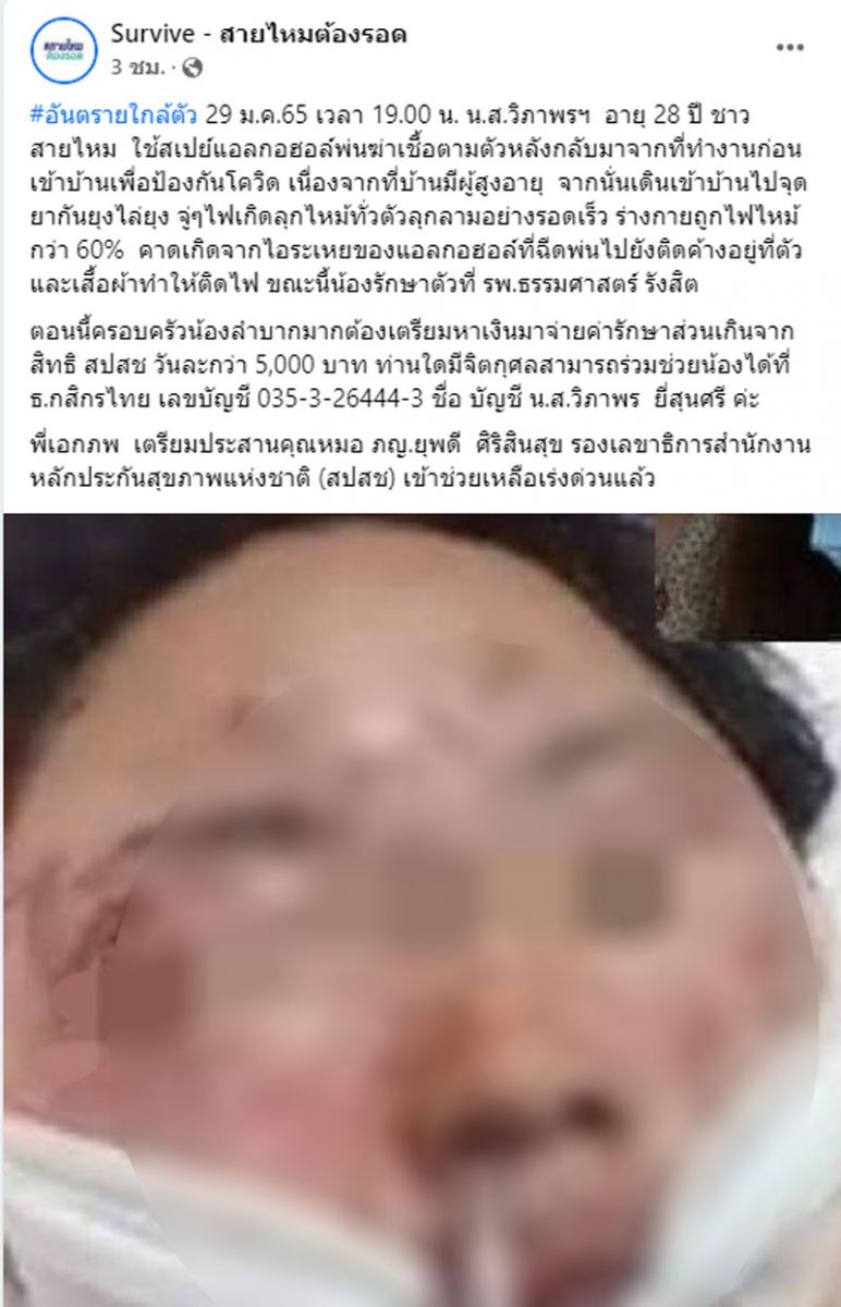 โดยระบุข้อความว่า “#อันตรายใกล้ตัว 29 ม.ค.65 เวลา 19.00 น. น.ส.วิภาพรฯ อายุ 28 ปี ชาวสายไหม ใช้สเปย์แอลกอฮอล์พ่นฆ่าเชื้อตามตัวหลังกลับมาจากที่ทำงานก่อนเข้าบ้านเพื่อป้องกันโควิด เนื่องจากที่บ้านมีผู้สูงอายุ จากนั่นเดินเข้าบ้านไปจุดยากันยุงไล่ยุง จู่ๆไฟเกิดลุกไหม้ทั่วตัวลุกลามอย่างรอดเร็ว ร่างกายถูกไฟไหม้กว่า 60% คาดเกิดจากไอระเหยของแอลกอฮอล์ที่ฉีดพ่นไปยังติดค้างอยู่ที่ตัวและเสื้อผ้าทำให้ติดไฟ ขณะนี้น้องรักษาตัวที่ รพ.ธรรมศาสตร์ รังสิต