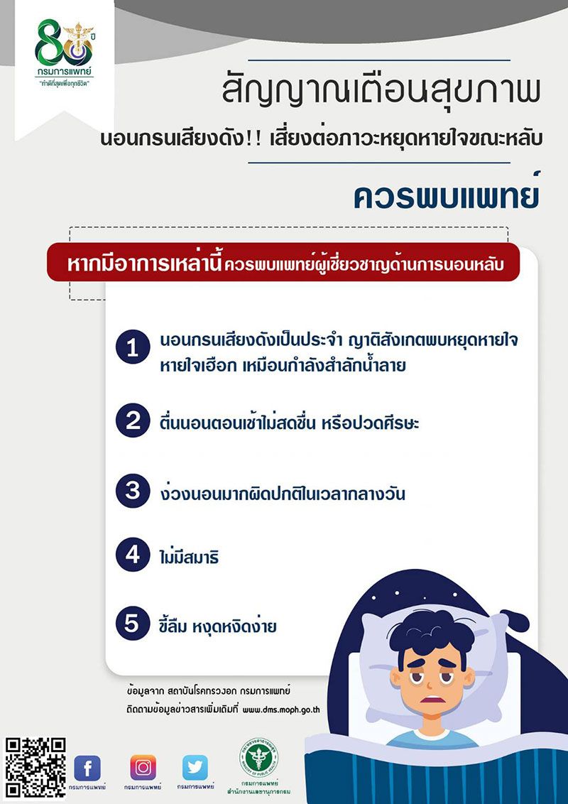 กรมการแพทย์ โดยสถาบันโรคทรวงอก เตือนนอนกรนเสียงดังเป็นประจำ ง่วงนอนมากผิดปกติในเวลากลางวัน อาจเสี่ยงต่อการเกิดภาวะหยุดหายใจขณะนอนหลับโดยไม่รู้ตัว