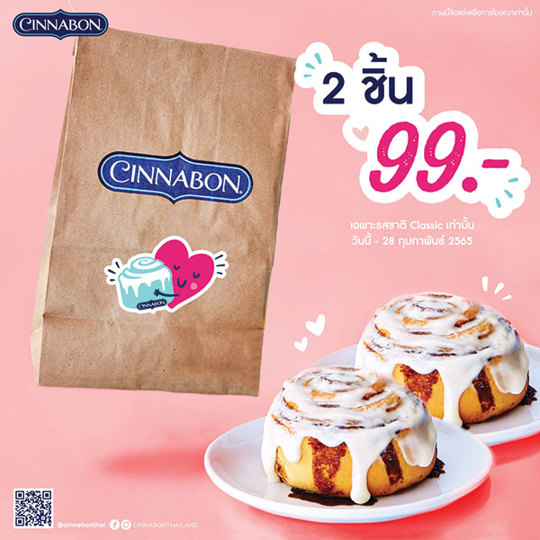 “ซินนาบอน” ชวนชิมซินนามอนโรล รสชาติดีที่สุดในโลก กับ Cinnabon Classic ซินนาบอนรสซิกเนเจอร์ 2 ชิ้นโตๆ ในราคา 99 บาท ตลอดเดือน ก.พ. ที่ ร้านซินนาบอน ทุกสาขา